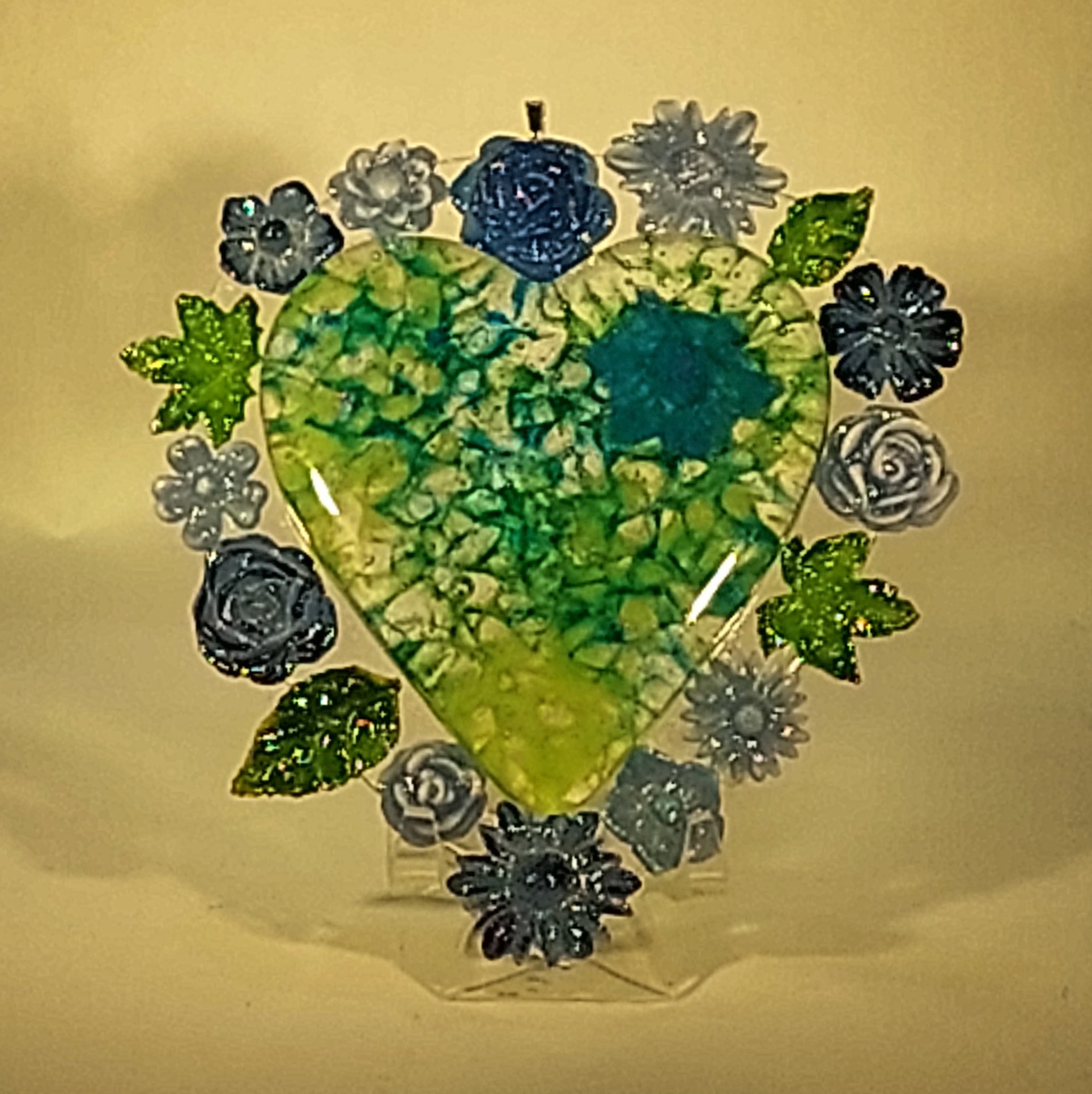 Kiln-formed glass elements fused to green glass.