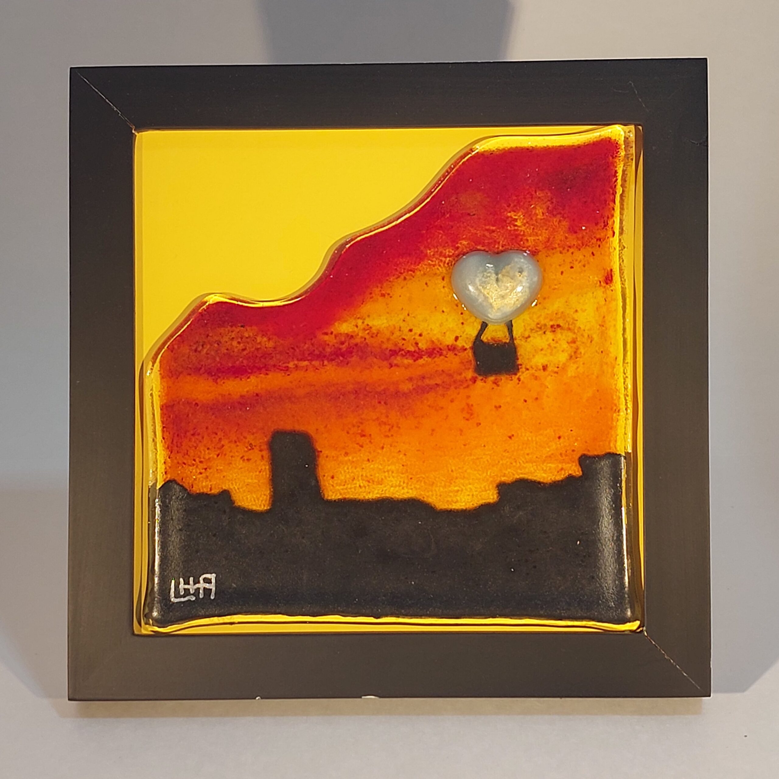 Kiln-formed glass painting with silver reactive elements.