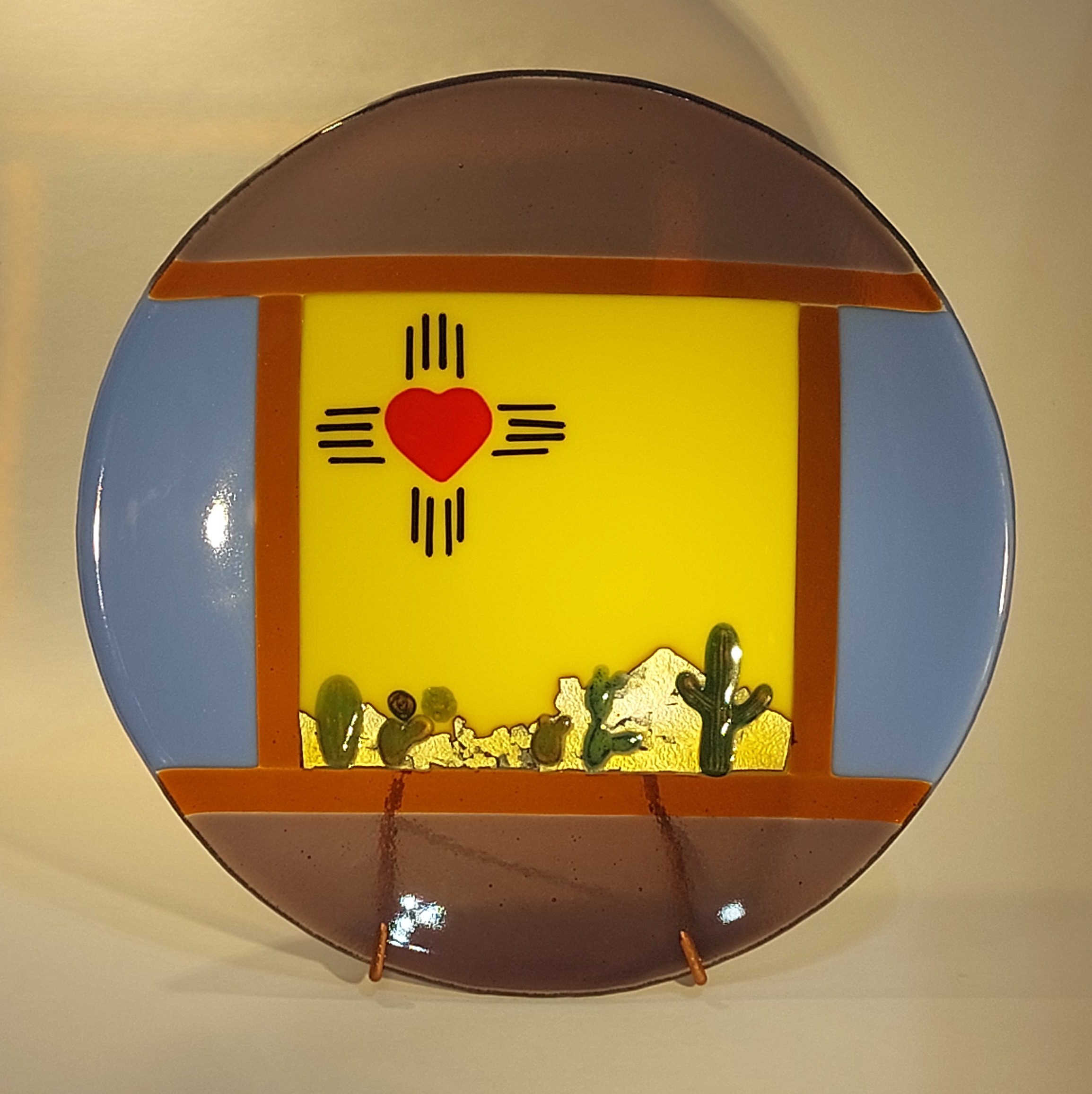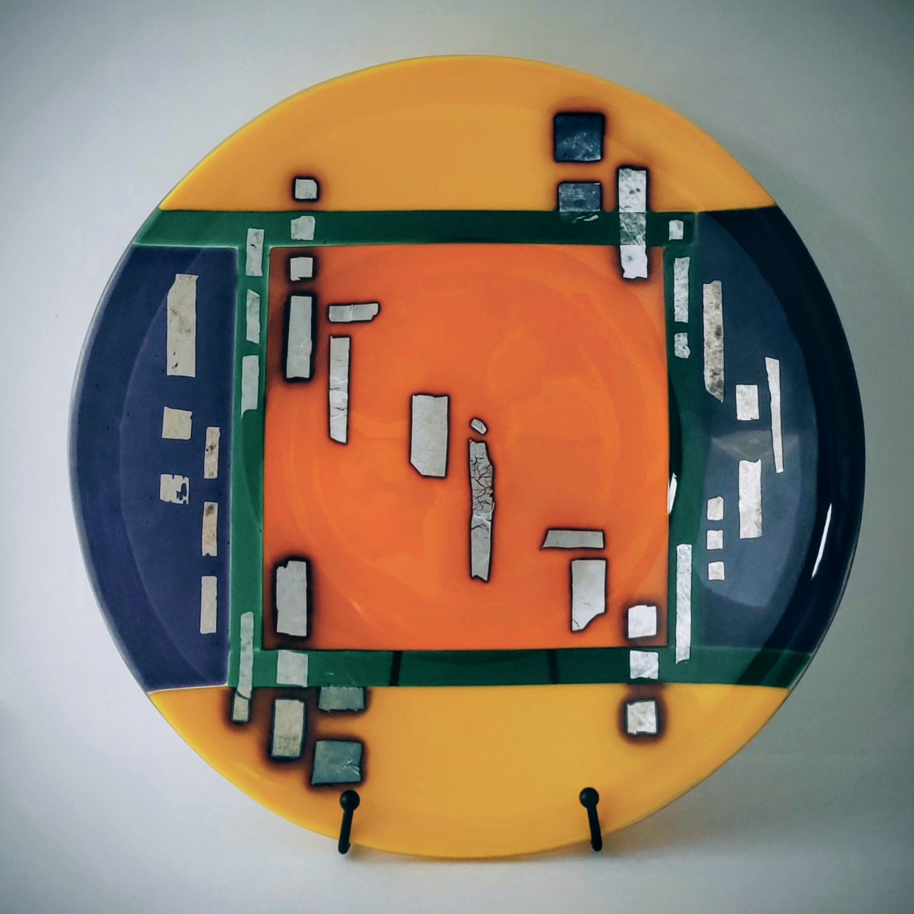 Kiln-formed glass platter with silver reactive elements.