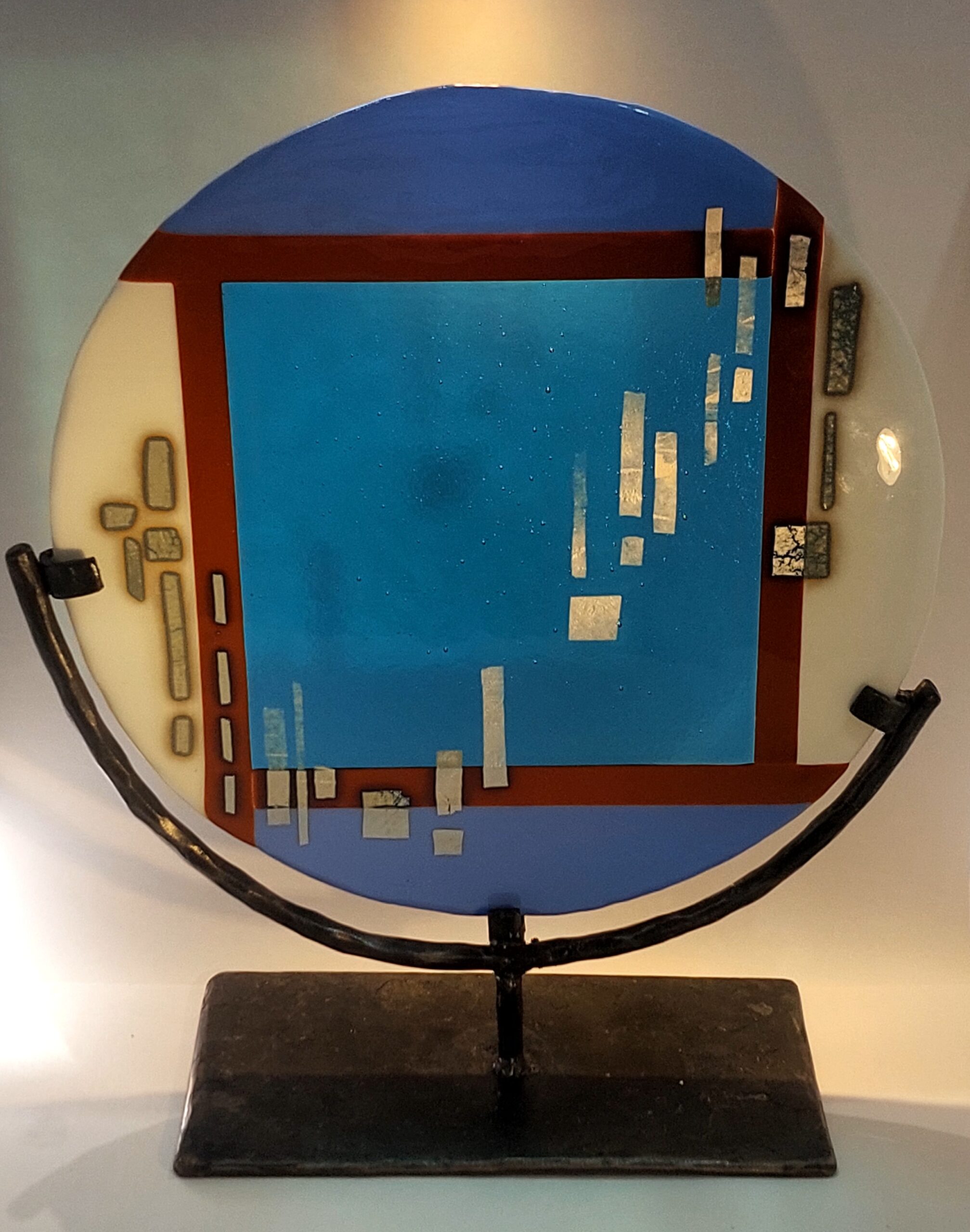 Kiln formed disc with silver reactive elements.